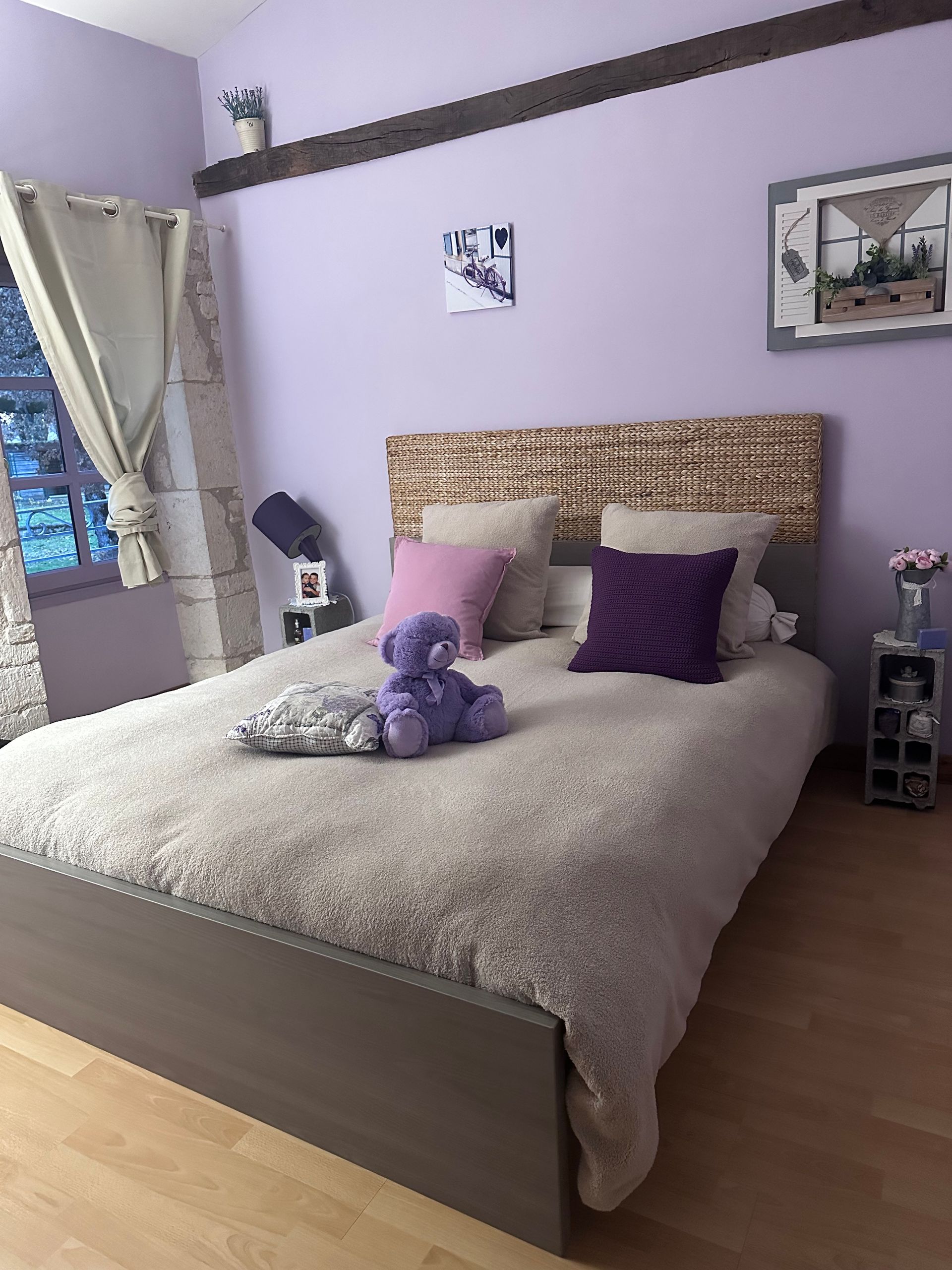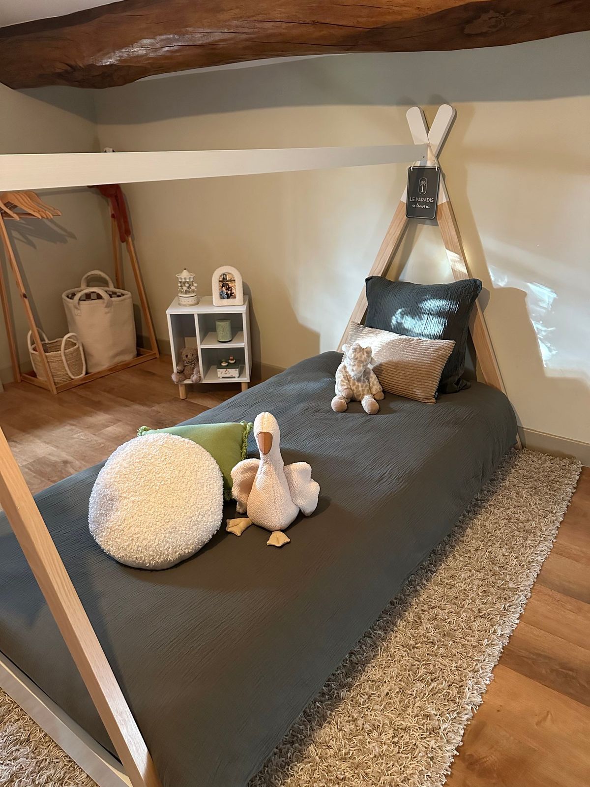 La suite familiale offre un espace généreux aux tons pastels, parfait pour accueillir petits et grands. Avec son lit double, son lit enfant et sa salle de bain attenante, elle incarne une ambiance chaleureuse et familiale.